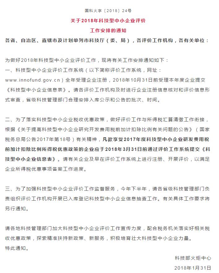 2018年1月31日,科技部火炬中心下发了国科火字〔2018〕24号《关于2018年科技型中小企业评价工作安排的通知》,原文如下: